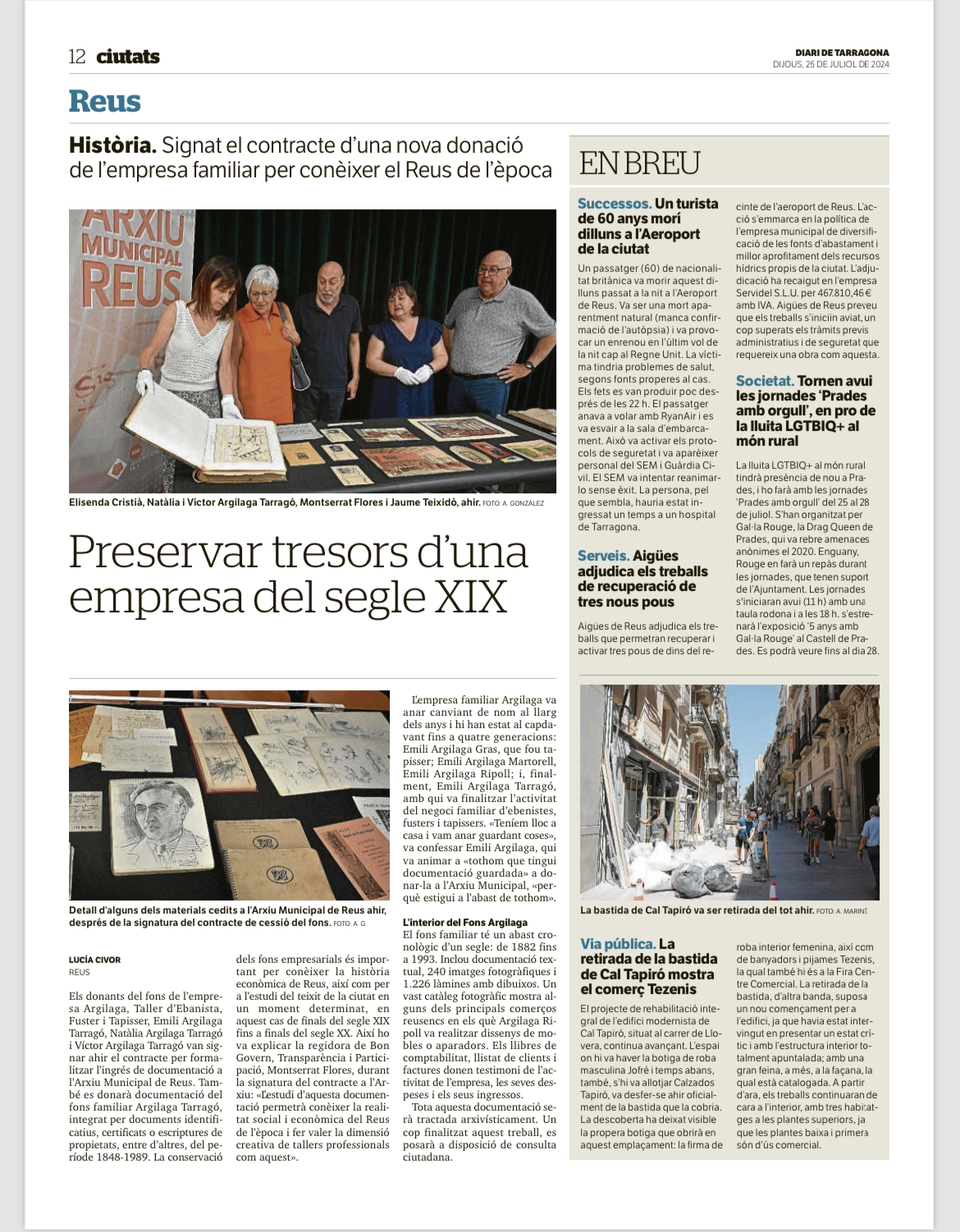 Dimecres 24 de juliol, a l’Arxiu Municipal s'ha signat el contracte d’una nova donació de documentació. La regidora de Bon Govern, Transparència i Participació, la Sra. Montserrat Flores Juanpere i els donants, el Sr. Emili Argilaga Tarragó, la Sra. Natàlia Argilaga Tarragó i el Sr. Víctor Argilaga Tarragó, han formalitzat l’ingrés del fons de l’empresa familiar «Argilaga. Taller d’Ebanista, fuster i tapisser», així com també documentació pertanyent a la família Argilaga Tarragó.