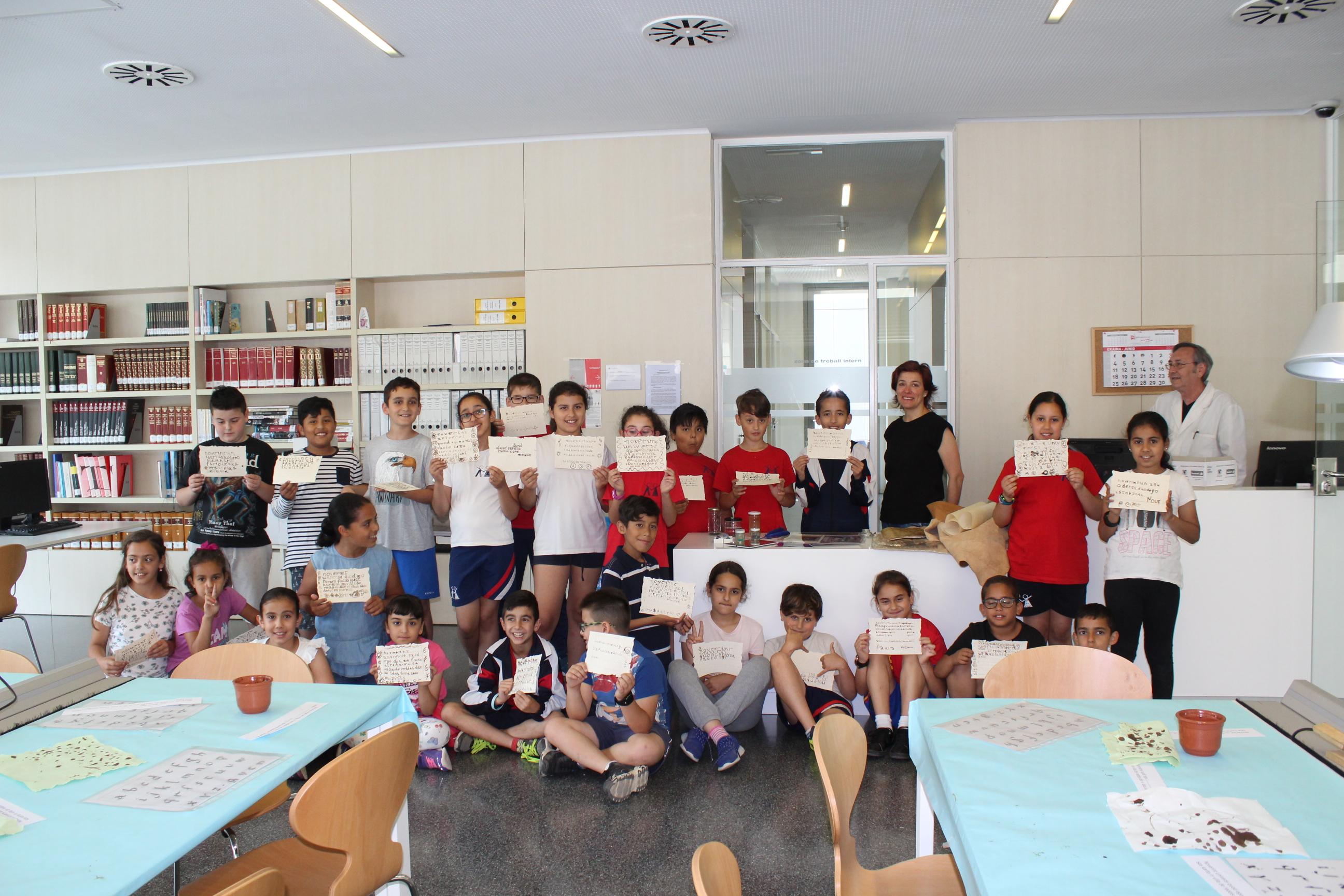 vendres dia 8 de juny, dos grups d'alumnes de 4t de l'escola Rubió i Ors han vingut a l'Arxiu a fer un taller d'escritura medieval.