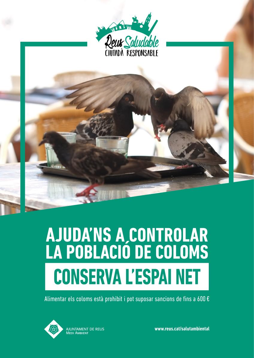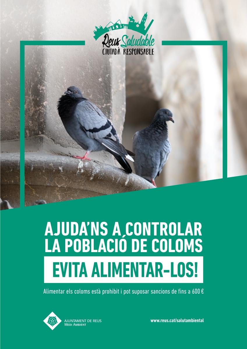 L’Ajuntament de Reus ha posat en marxa una campanya de sensibilització per implicar el conjunt de la ciutadania en el control de la població de coloms. El consistori destina més de 100.000 euros l’any a mesures de control i prevenció, però es necessita la col·laboració de tota la ciutat perquè les accions siguin efectives. La campanya se suma als múltiples esforços que ja hi destina el Govern de Reus, amb accions des dels àmbits del medi ambient i la salut pública, l’urbanisme, la via pública, la sensibilització i la sanció.
