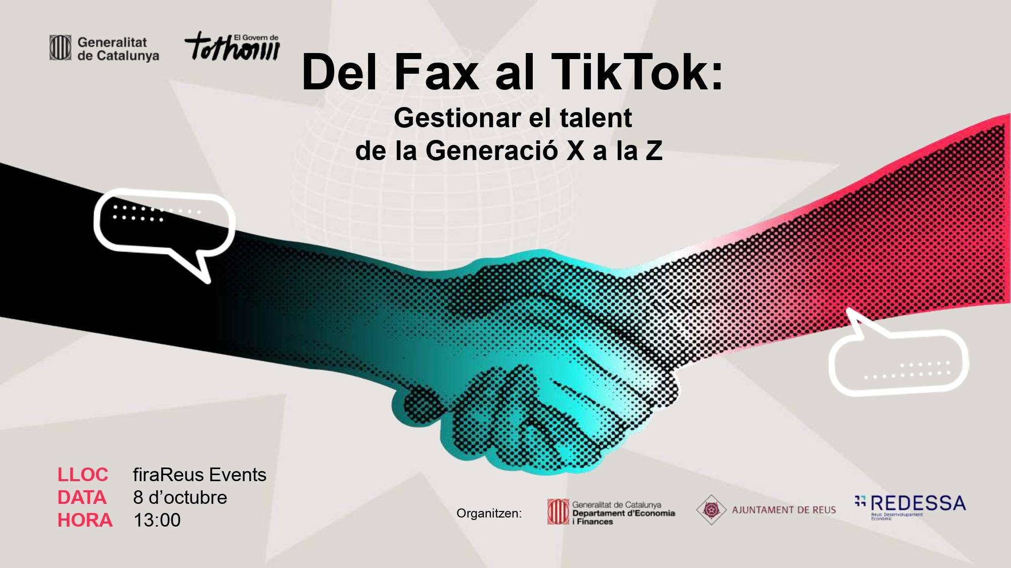 La Generalitat de Catalunya i l’Ajuntament de Reus, a través de la Regidoria de Promoció Econòmica, Innovació i Coneixement, impulsen una jornada per enllaçar les necessitats empresarials liderades per persones de les generacions X i Y (millenial) amb els treballadors de la generació Z. La jornada, que també compta amb la col·laboració de REDESSA, tindrà lloc el pròxim 8 d’octubre, de les 13h a 16h, a Fira Reus Events, sota el títol “Del Fax al TikTok: gestionar el talent de la Generació X a la Z”.