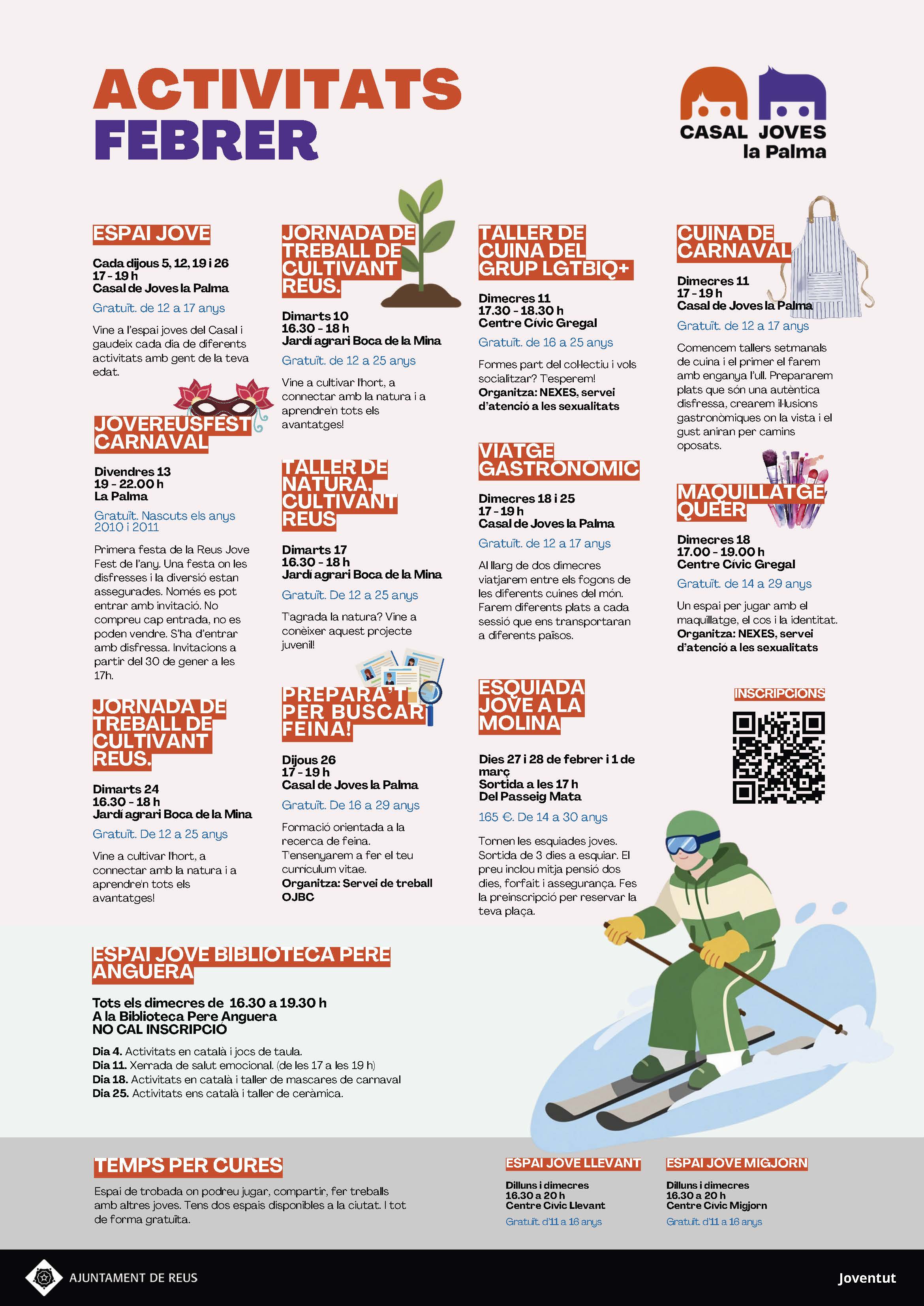 Connexió amb la natura és una altra proposta programada per aquest febrer. Els dimarts 10, 17 i 24 el projecte Cultivant Reus convida els joves a participar en la cura i manteniment d’un hort urbà al jardí agrari Boca de la Mina, amb activitats diverses com una jornada de treball a l’hort per sembrar els productes de la temporada, manteniment, tallers sobre natura i sostenibilitat i un espai culinari on aprendre a cuinar productes de proximitat i receptes saludables.