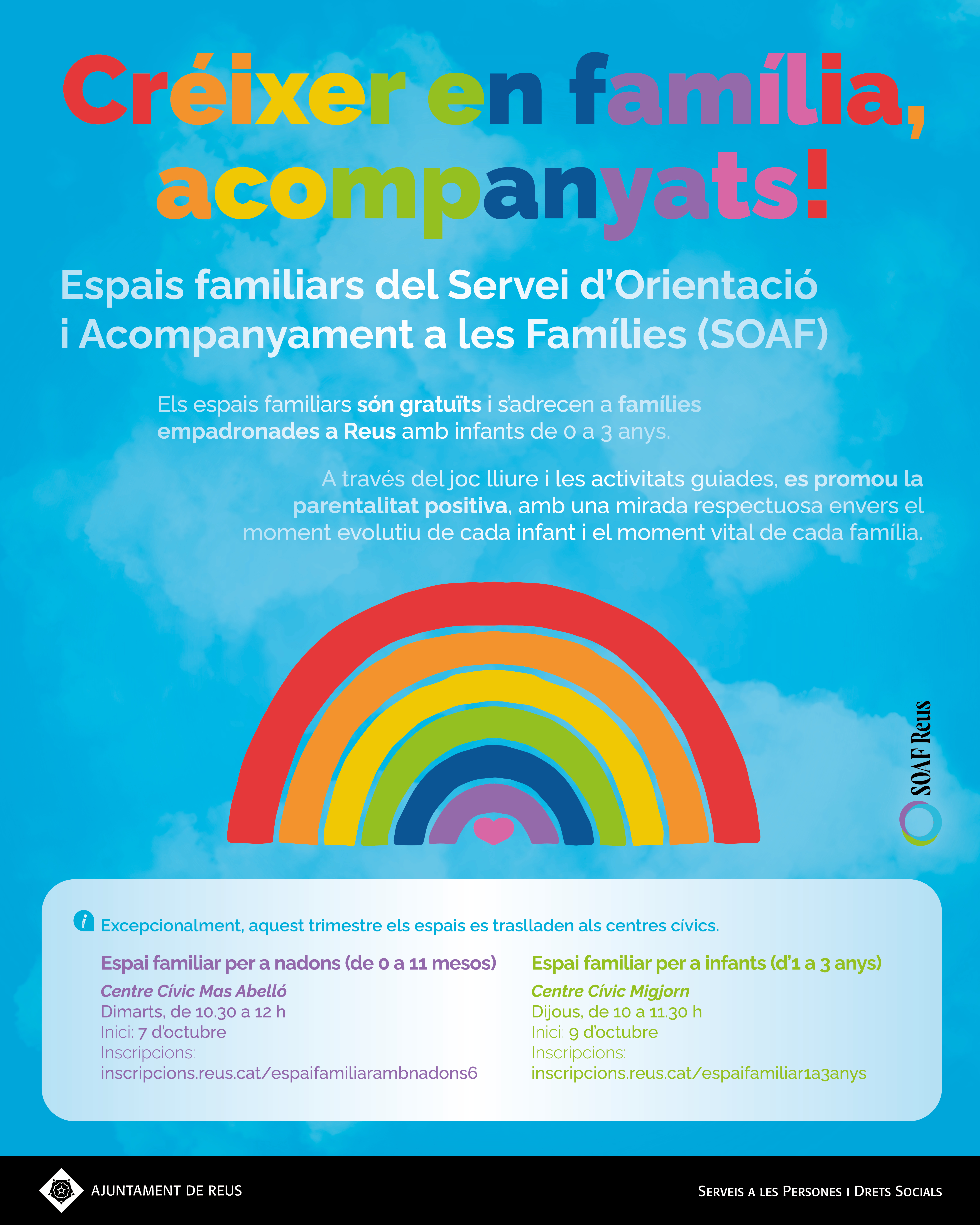 El Servei d’Orientació i Acompanyament a les Famílies (SOAF) és un servei gratuït de l’Ajuntament de Reus, impulsat des de l’Àrea de Serveis a les Persones i Drets Socials, i cofinançat pel Departament de Drets Socials de la Generalitat de Catalunya a través del Contracte Programa dels Serveis Socials 2022-2025.