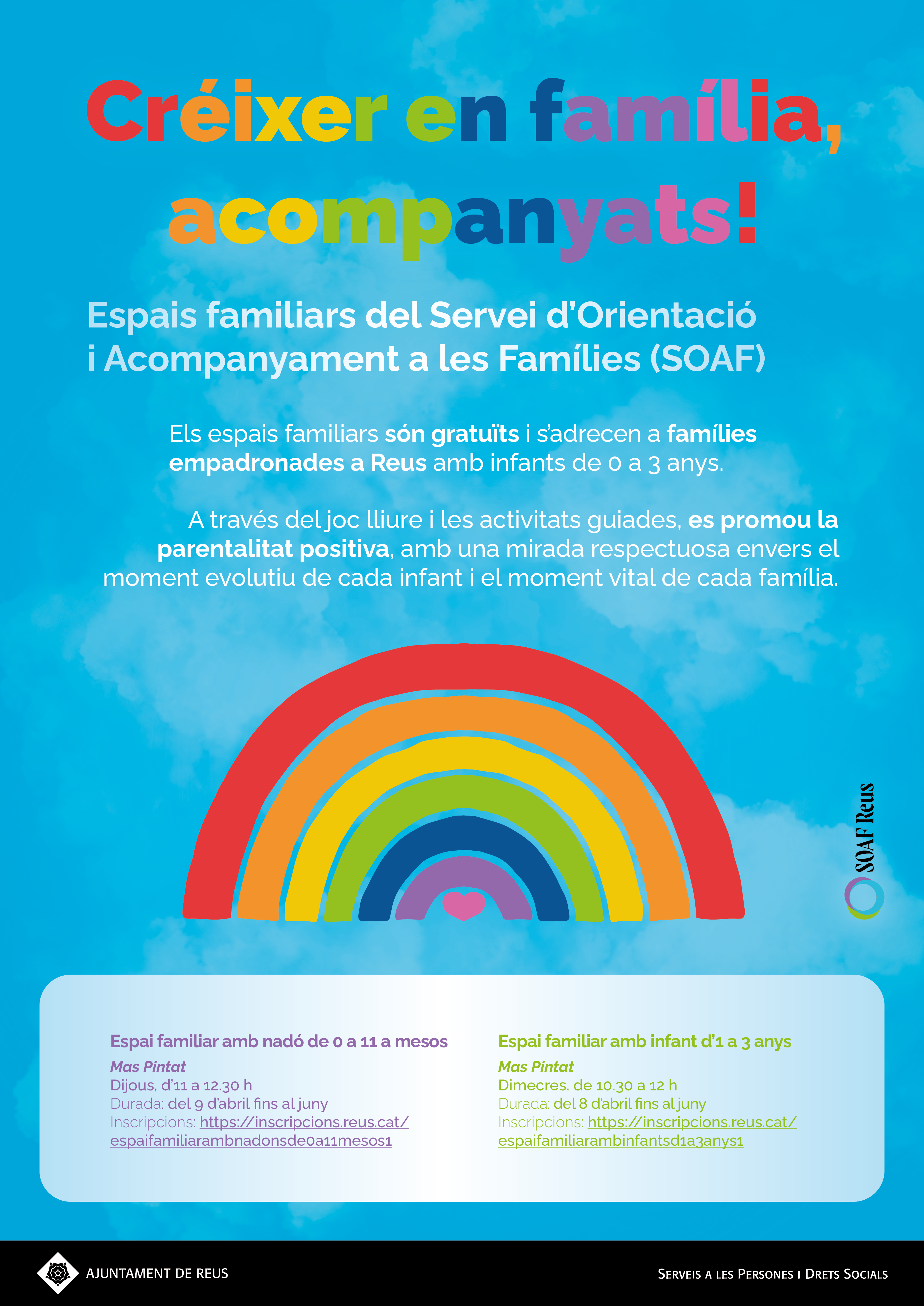 El Servei d’Orientació i Acompanyament a les Famílies (SOAF) és un servei gratuït de l’Ajuntament de Reus, impulsat des de l’Àrea de Serveis a les Persones i Drets Socials i cofinançat pel Departament de Drets Socials de la Generalitat de Catalunya a través del Contracte Programa dels Serveis Socials 2025-2028.