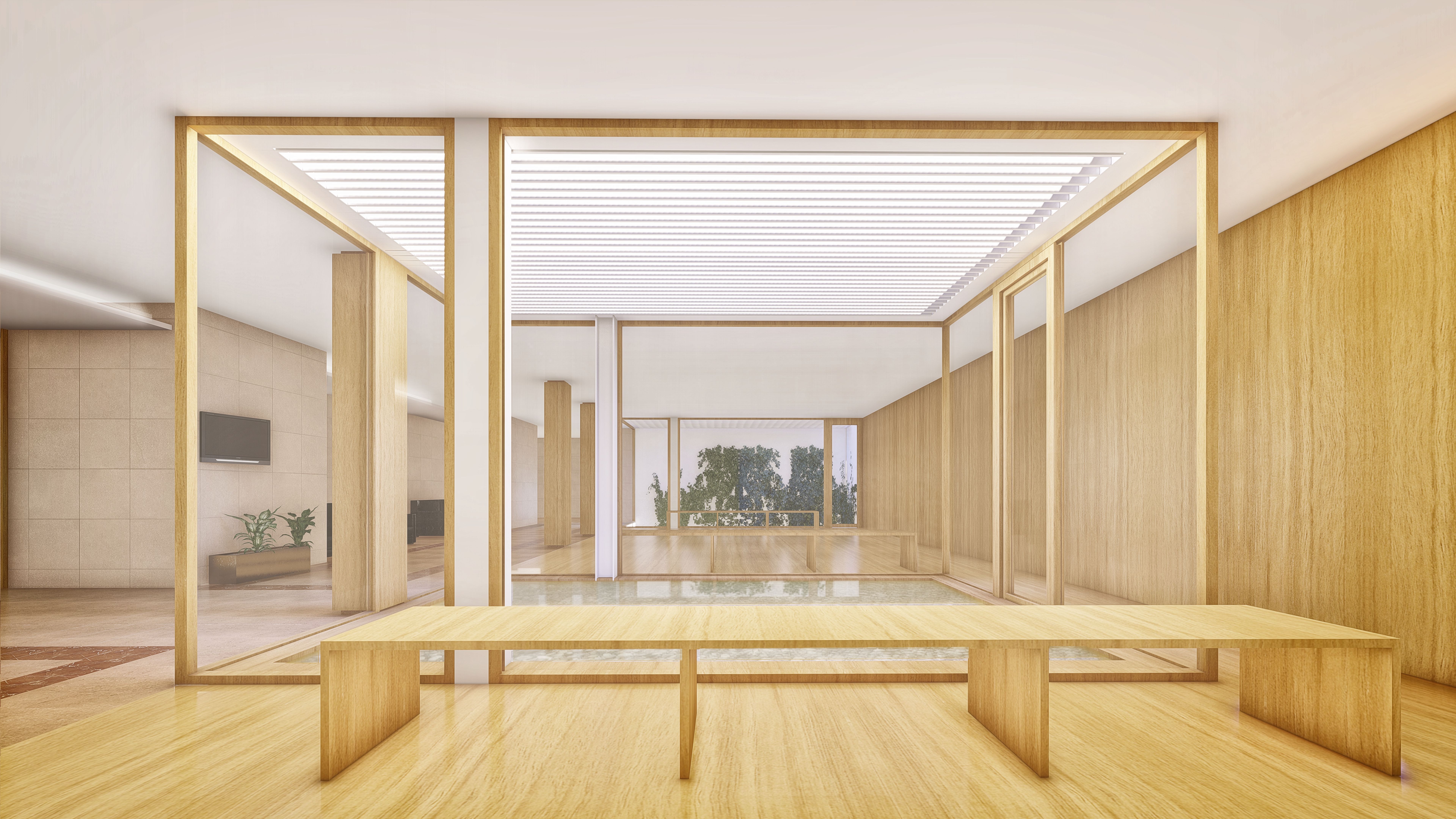 Així, el passadís d’accés a les sales de vetlla es recularà uns 4m de la façana, en una llargada de 27m. S’aconseguirà crear així un espai de recolliment amb l’obertura de dos patis ubicats als extrems de l’ampliació i un tercer pati al centre. Aquests patis, no tenen vistes a l’exterior, però facilitaran llum i ventilació.