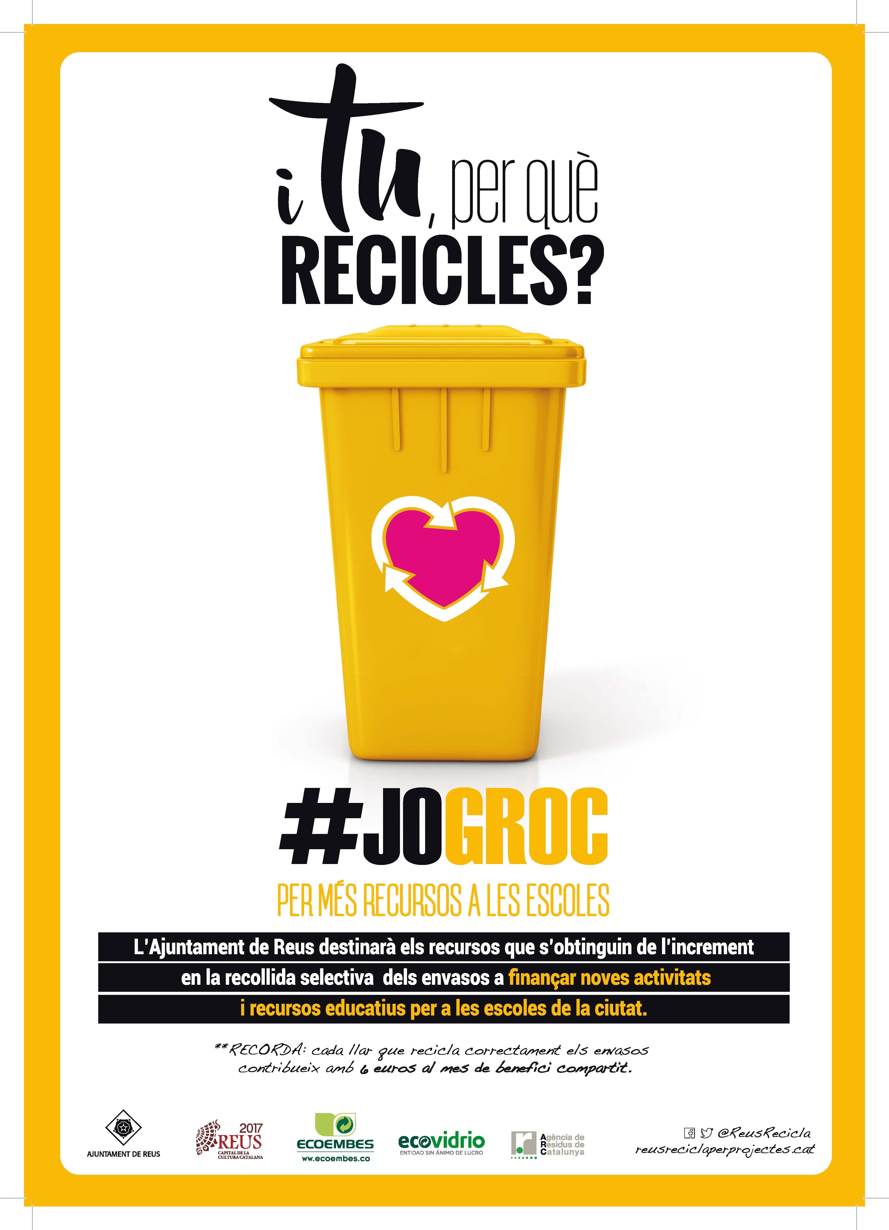 La campanya “I tu, per què recicles?” organitza una jornada festiva per promoure el reciclatge d'envasos adreçada especialment als infants i joves durant aquest dissabte 25 de març amb activitats al matí i a la tarda a la plaça d'Enric Yzaguirre. Aquesta jornada culmina una setmana d'activitats realitzada als centres escolars amb el lema #JoGroc en què s'han fet accions de sensibilització amb l'alumnat per incrementar el reciclatge d'envasos. Aquesta campanya preveu que l'increment de recursos que es generi a l'Ajuntament de Reus amb la recollida selectiva es dediqui a projectes socials i culturals, en el cas dels envasos a projectes educatius i beneficis pels centres.