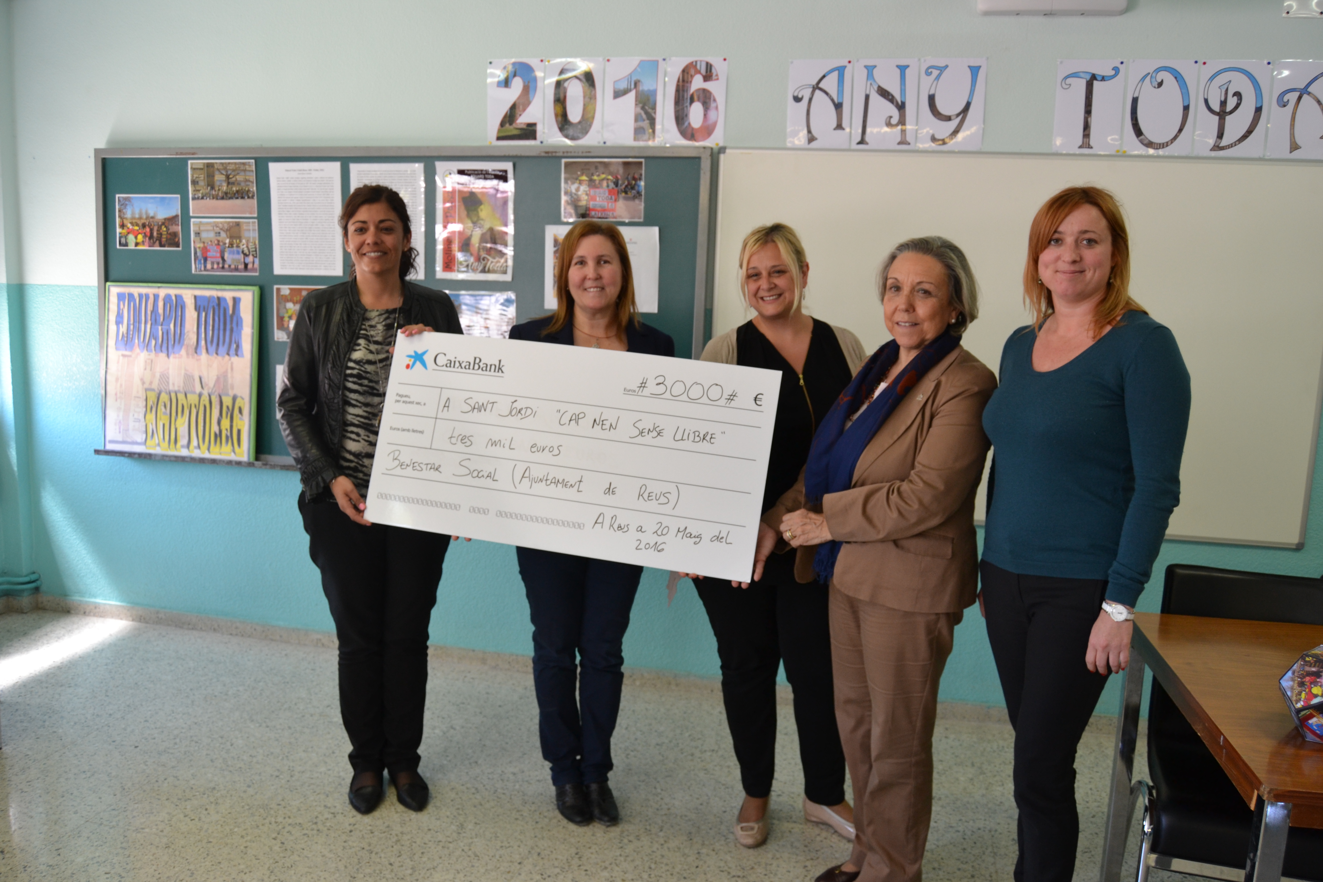 Aquest divendres al matí s’ha fet a l’Escola Eduard Toda l’acte de lliurament del xec amb l’import recaptat. Tatiana Caro, directora d’Institucions a Tarragona de CaixaBank, ha donat el xec a les regidores d’Ensenyament i Política Lingüística, M. Dolors Sardà, i Projecció de Ciutat, Montserrat Caelles, acompanyades per la directora de l’Escola Eduard Toda, Rosa M. Boqué.