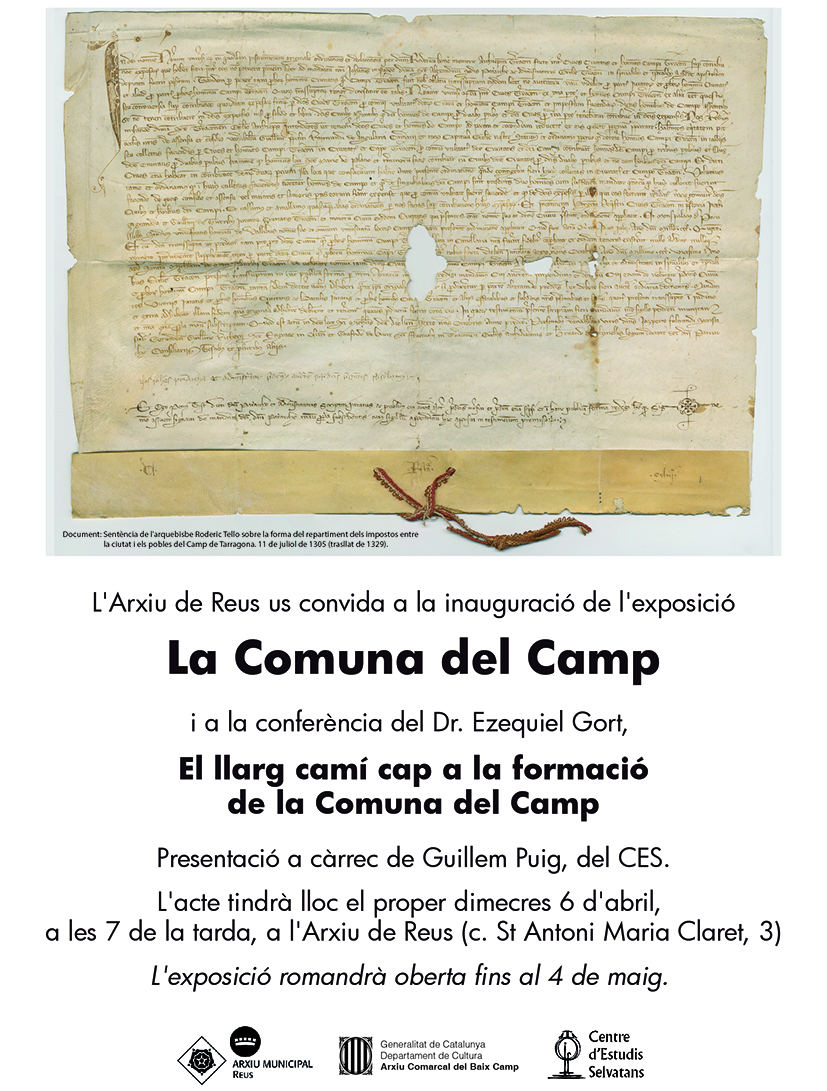 L'Arxiu Municipal és escenari aquest dimecres, 6 d'abril (19:00 h), de la inauguració de l'exposició “La Comuna del Camp”, una producció del Centre d'Estudis Selvatans que relata la gènesi i evolució d'aquest ens supramunicipal medieval i que es podrà veure a l'Arxiu de Reus (cr. de Sant Antoni Maria Claret, 3) fins al 4 de maig.