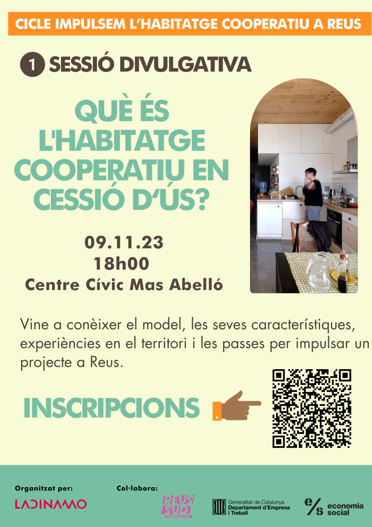 En aquesta primera sessió divulgativa i de sensibilització s’explicaran les principals característiques de l’habitatge cooperatiu en cessió d’ús, un model d’accés a l’habitatge no especulatiu, inclusiu i sostenible, de propietat col·lectiva. La sessió es dividirà en tres parts. A les 18.00 h arrencarà amb l’explicació de què és el model d’habitatge cooperatiu en cessió d’ús, a continuació es veuran projectes de diferents tipologies en convivència o en procés de promoció i finalment s'anomenaran les passes a seguir per tirar endavant un projecte. Abans de finalitzar la xerrada a les 19:30 s’obrirà un torn de preguntes i de resolució de dubtes. L’assistència és gratuïta, però cal fer inscripció prèvia.