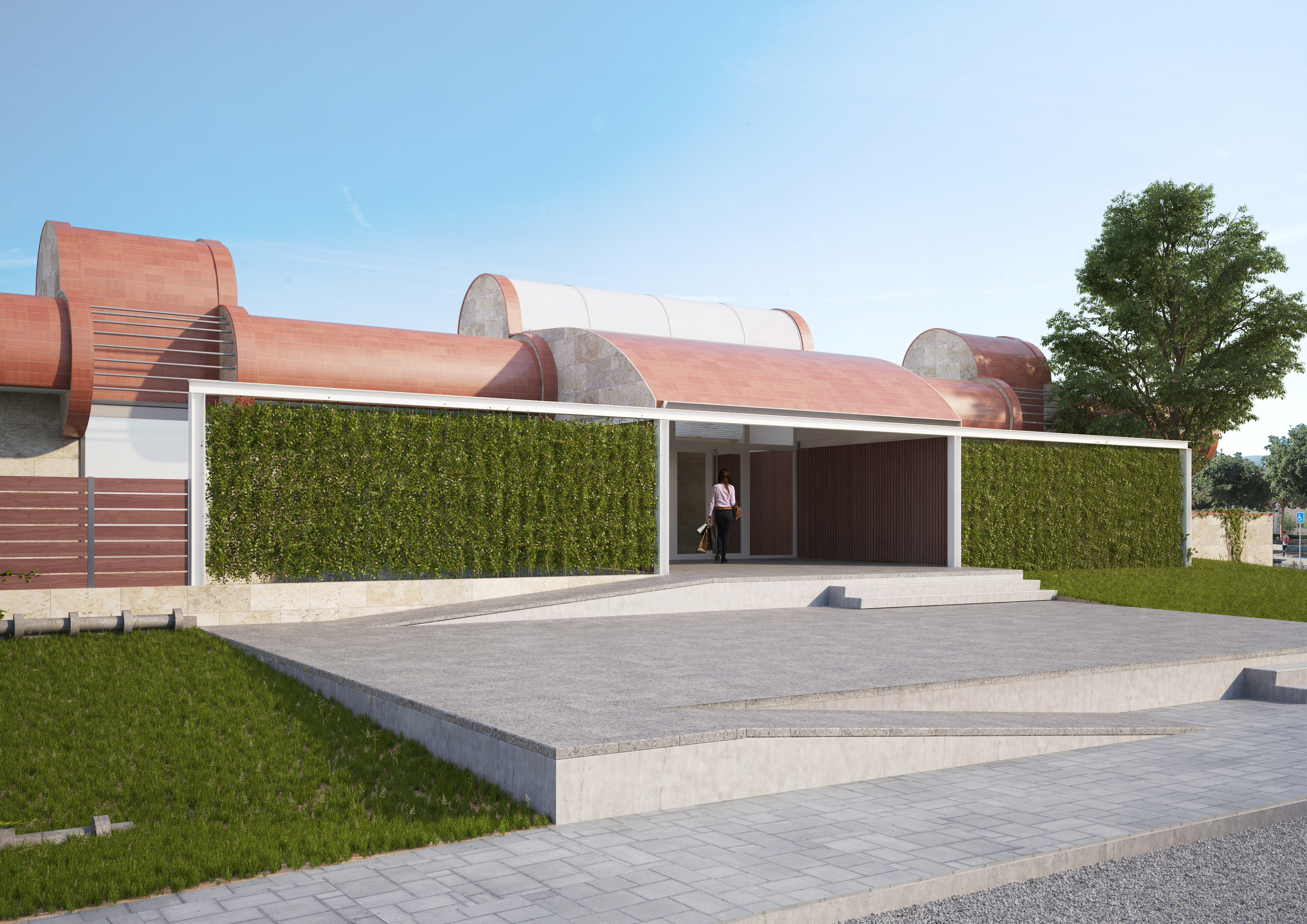 Com a fons d’aquest espai exterior i com a nexe amb el vestíbul interior, es construeix un espai cobert de 6,6 metres d’amplària i 4,20 metres de llargària, definit per una volta com a sostre i unes gelosies de llistons de fusta com a laterals. Dels laterals es prolonguen uns pòrtics metàl lic a banda i banda que serveixen com a suport per crear uns murs vegetals amb heure de fulla petita.