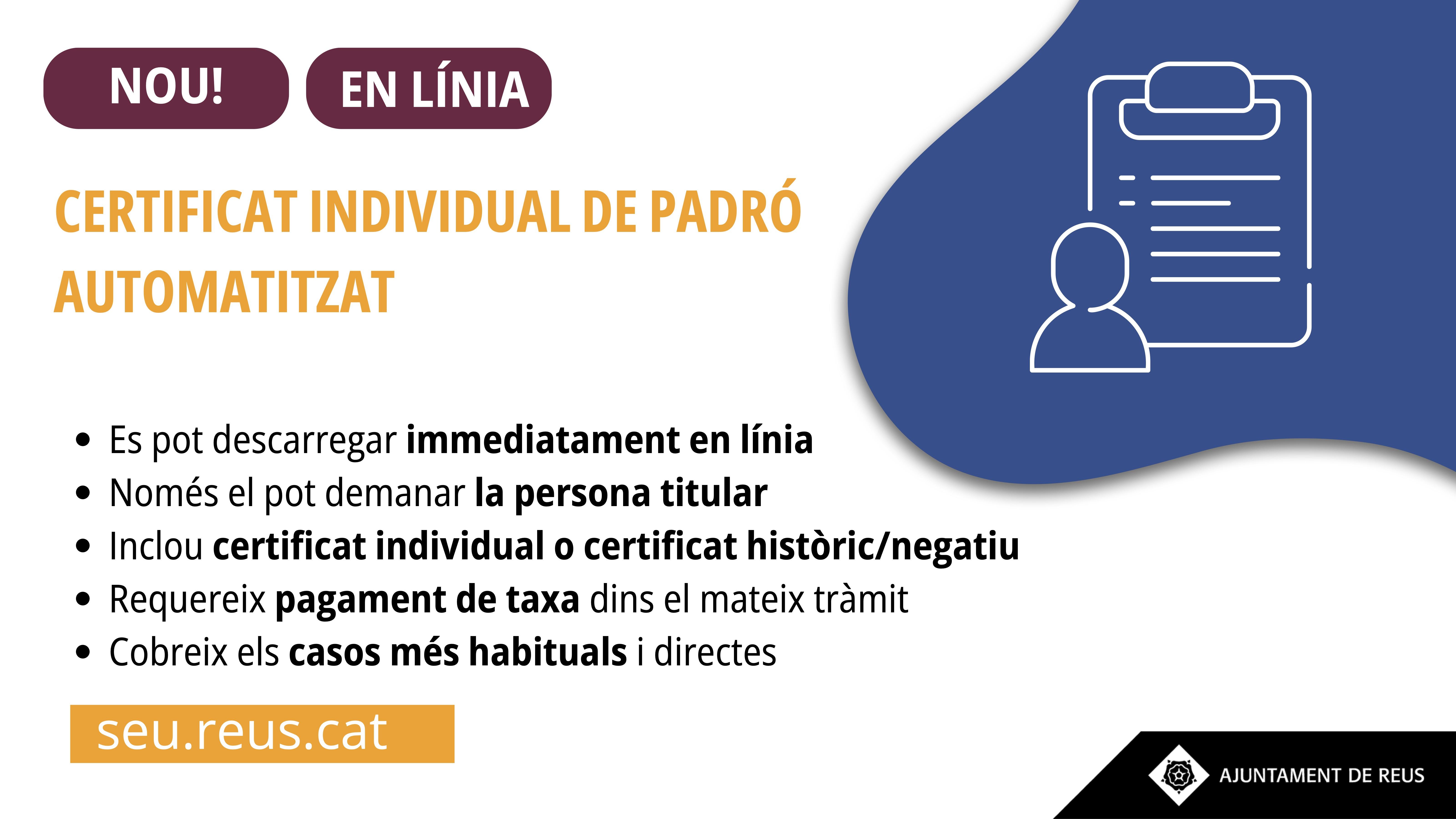 L’Ajuntament de Reus ha agilitzat el tràmit per tal que la ciutadania pugui obtenir de manera immediata la versió automatitzada del certificat individual d’empadronament. Si fins ara la ciutadania havia d’esperar a la tramitació interna municipal per obtenir el certificat individual o històric individual, a partir d’ara els pot sol·licitar en línia a través de la seu electrònica municipal, la tramitació es fa de manera automatitzada, i els documents es poden descarregar al moment, un cop completats els processos.