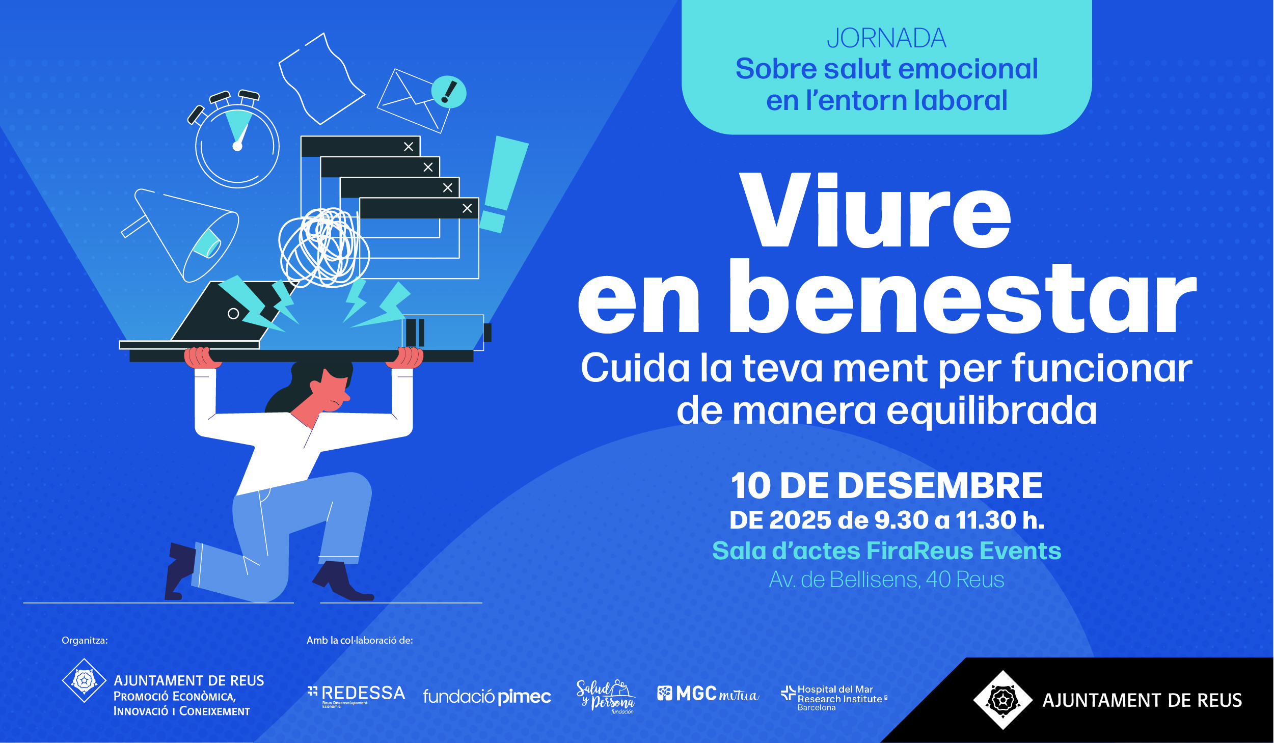 La Regidoria de Promoció Econòmica, Innovació i Coneixement de l’Ajuntament de Reus, per mitjà de la Fundació PIMEC, organitza el pròxim 10 de desembre de 2025, la jornada “Viure en benestar. Cuida la teva ment per funcionar de manera equilibrada”, una sessió de sensibilització i formació orientada a millorar la salut emocional de les empreses i professionals del teixit econòmic local.