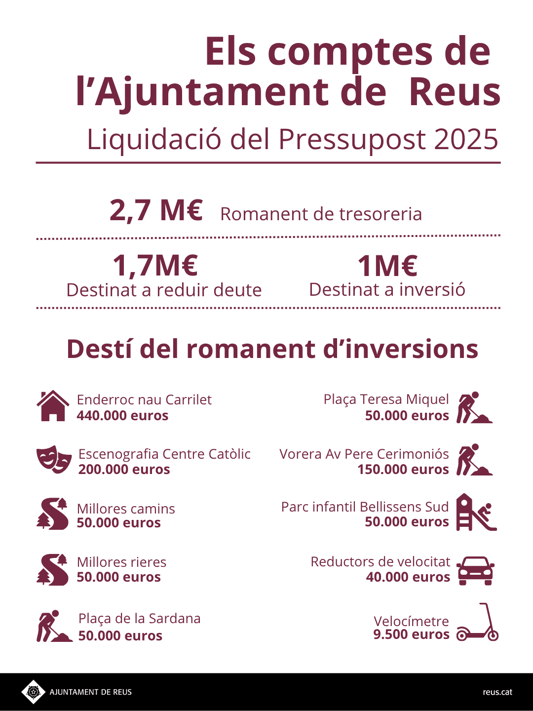 L’Ajuntament de Reus ha tancat el pressupost municipal de 2025 amb un superàvit de 2,7 milions d’euros, 1,7 dels quals es destinaran a amortitzar deute i el milió restant a inversions prioritàries com habitatge, la millora de la via pública, la cultura i el medi ambient. L’alcaldessa, Sandra Guaita, i el regidor de Serveis Generals, Hisenda i Bon Govern, acompanyats pels portaveus dels tres grups municipals que integren el govern han presentat la liquidació dels comptes i les prioritats d’inversió.