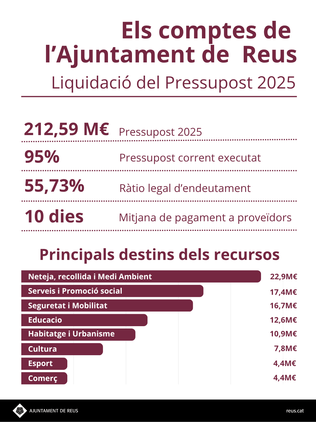 L’Ajuntament de Reus va tancar l’exercici 2025 amb les finances sanejades, un romanent de tresoreria positiu, un coeficient d’endeutament baix i una mitjana anual de pagament a proveïdors molt per sota del que exigeix la llei.