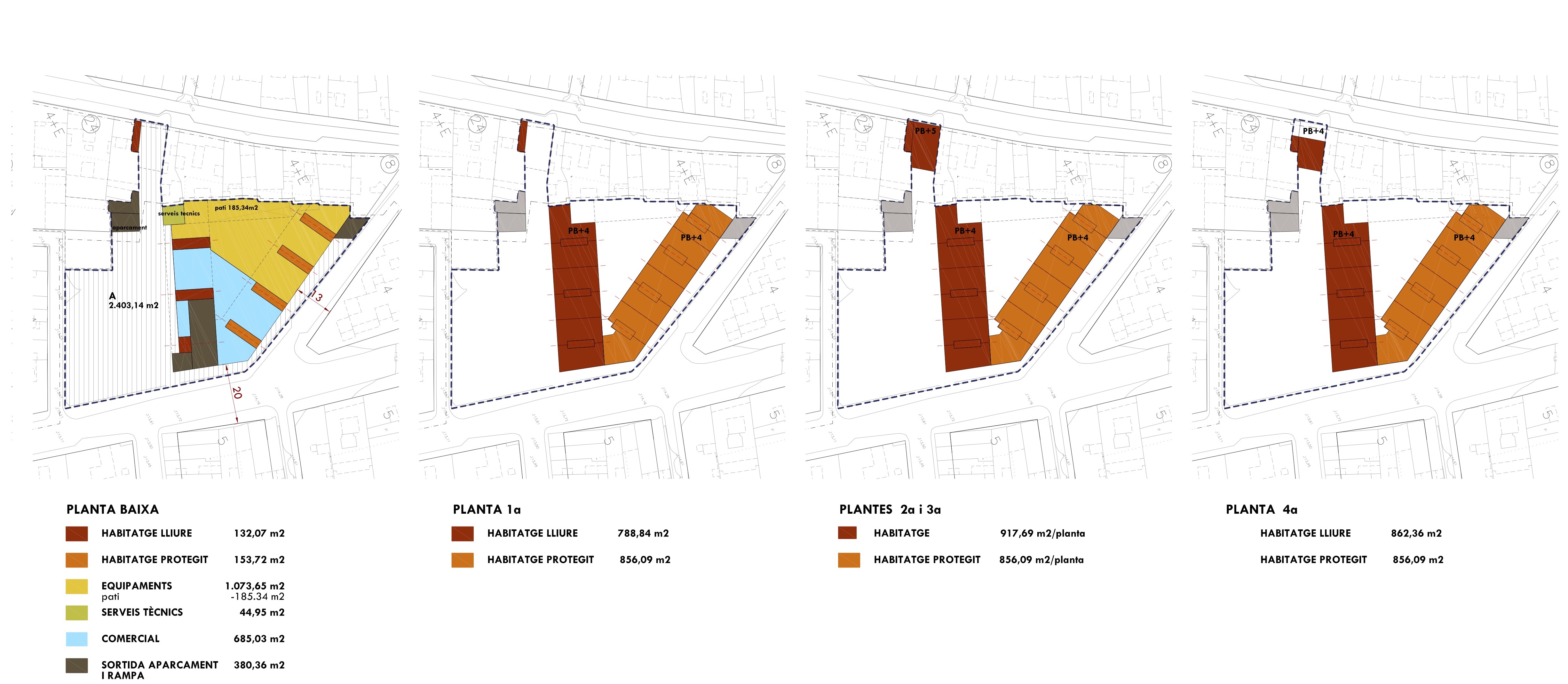 Habitatge. L'habitatge s'emplaça en les plantes 1a, 2a, 3a i 4a del projecte. El 30% del sostre residencial es destina a habitatge amb protecció oficial. 35 habitatges que s'emplacen a la façana de l'edifici que limita amb el carrer d'Arnavat i Vilaró. L'habitatge lliure representa el 70% del sostre residencial. Preveiem inicialment 45 habitatges, amb façana al gran espai lliure i el carrer de l'Àngel.
