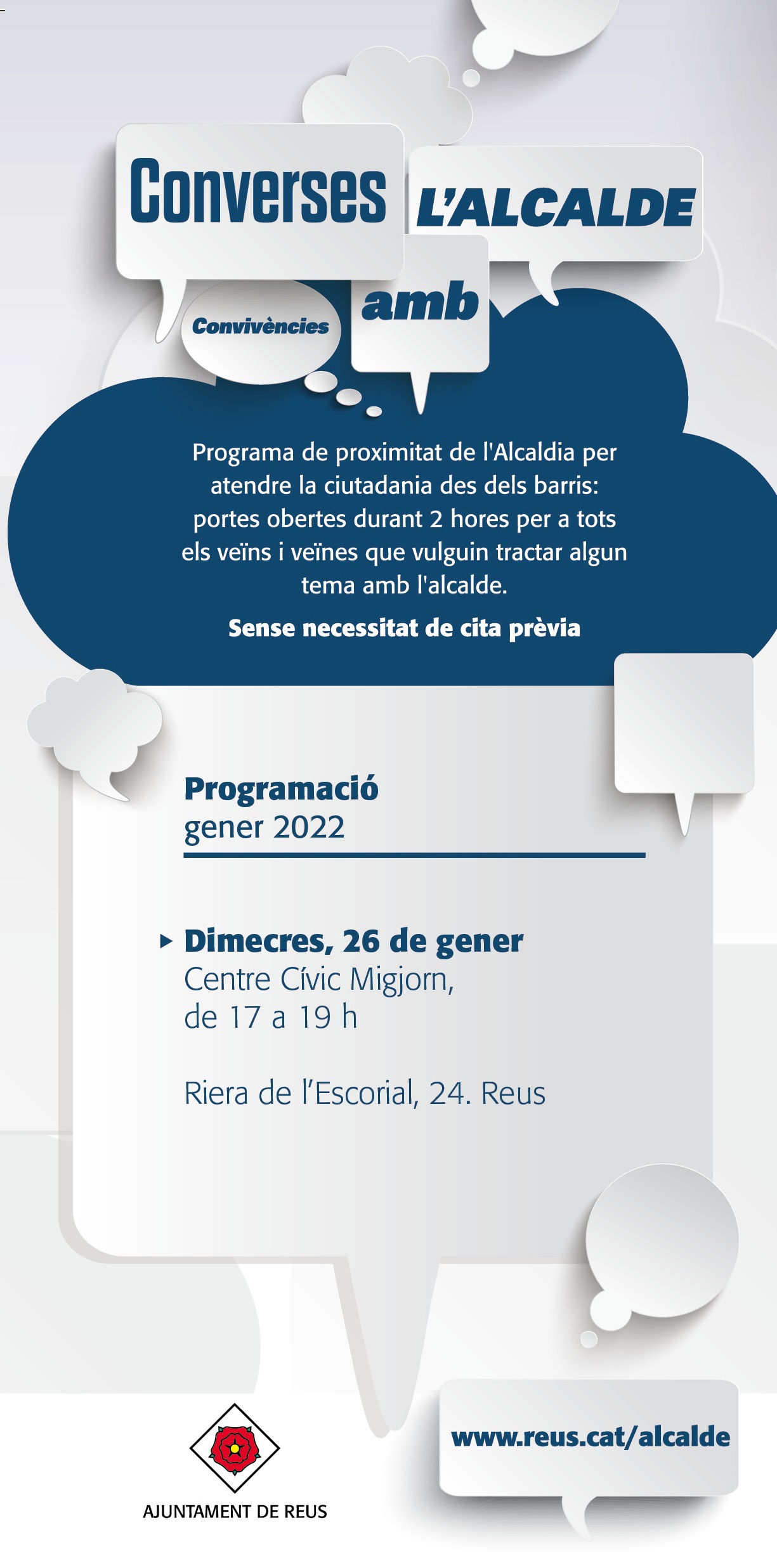 D’altra banda, el dimecres 26 a la tarda, de 17.00 a 19.00 hores, tindran lloc les “Converses amb l’alcalde” al Centre Cívic Migjorn, on l’alcalde atendrà sense cita prèvia els veïns i veïnes de la zona que s’hi apropin per recollir peticions, inquietuds i intercanviar impressions directament amb la ciutadania.