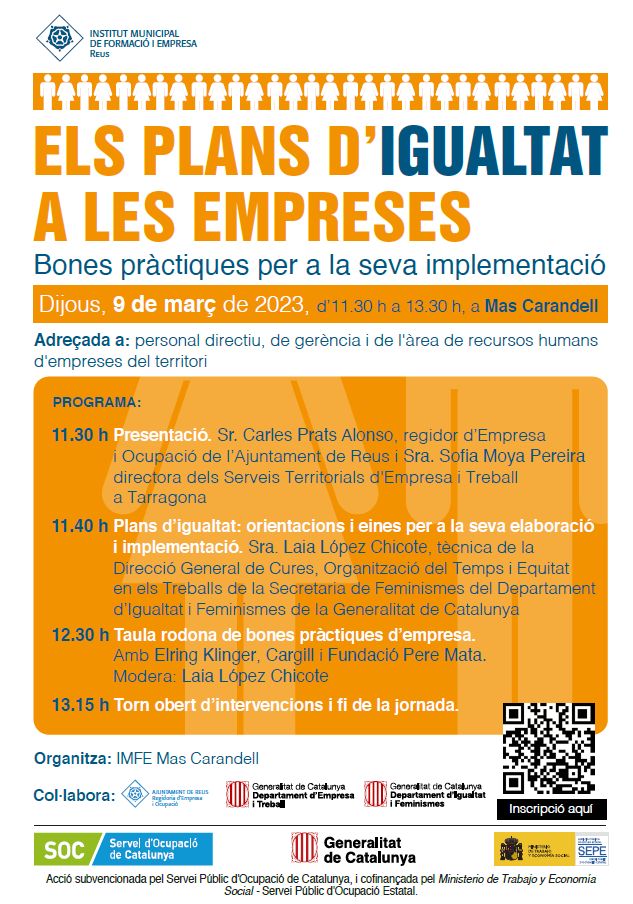 El proper dijous, 9 de març, d’11.30 a 13.30 hores, l’IMFE Mas Carandell organitza a les seves instal·lacions la jornada Els plans d’igualtat a les empreses, en la que participaran empreses locals per exposar bones pràctiques per a la integració de la igualtat d’oportunitats en l’àmbit laboral i la implementació de plans, i que també comptarà amb la col·laboració del Departament d’Igualtat i Feminismes de la Generalitat de Catalunya.