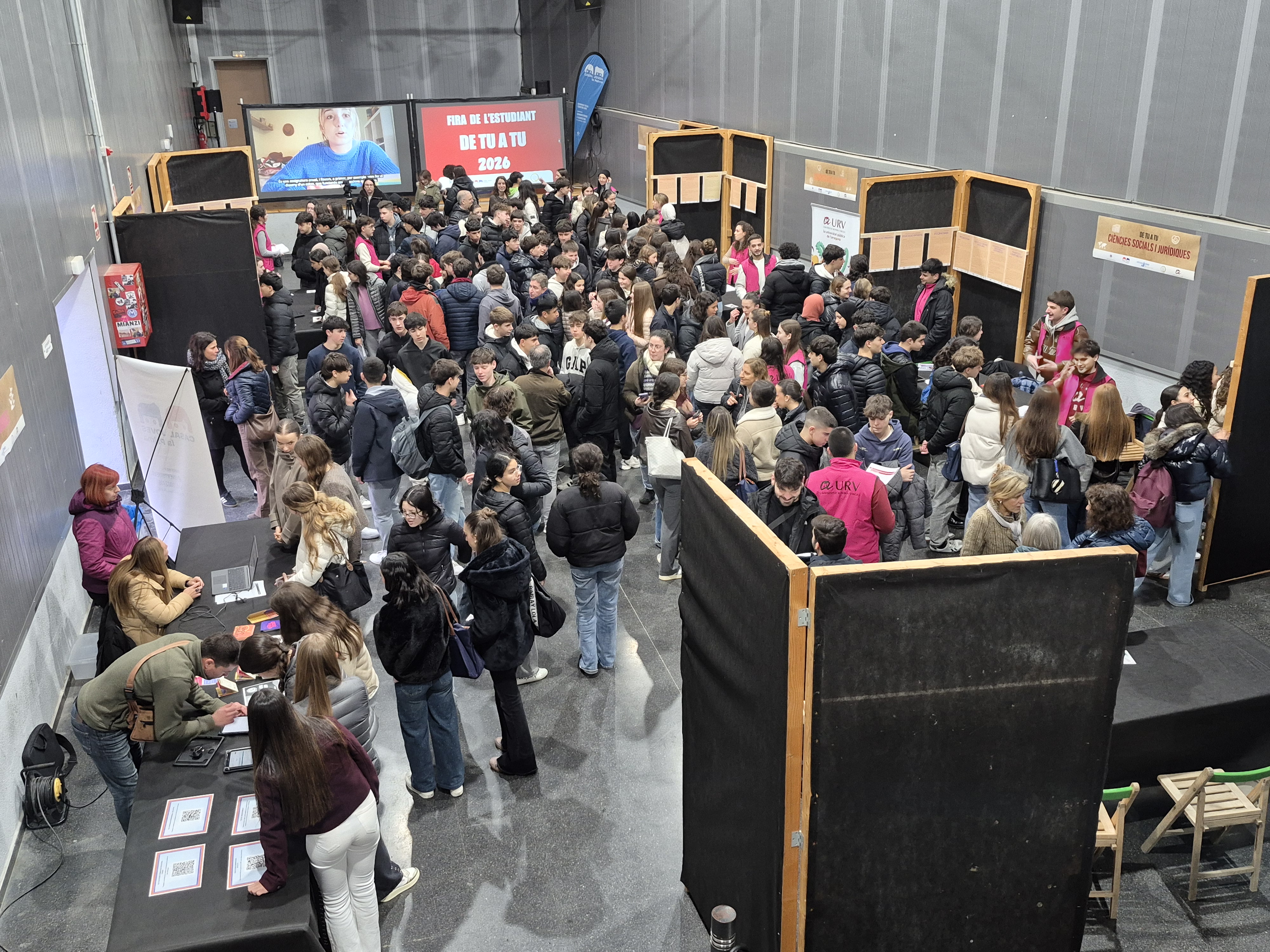 Aquest dimecres, 4 de febrer, a la sala polivalent de La Palma té lloc la fira De tu a tu, una jornada d'orientació cap als estudis universitaris protagonitzada pels estudiants de diferents graus de la URV. Al llarg del matí, hi assistiran uns 550 alumnes i els seus professors acompanyants de vuit centres de secundària de Reus i un de la comarca del Baix Camp.