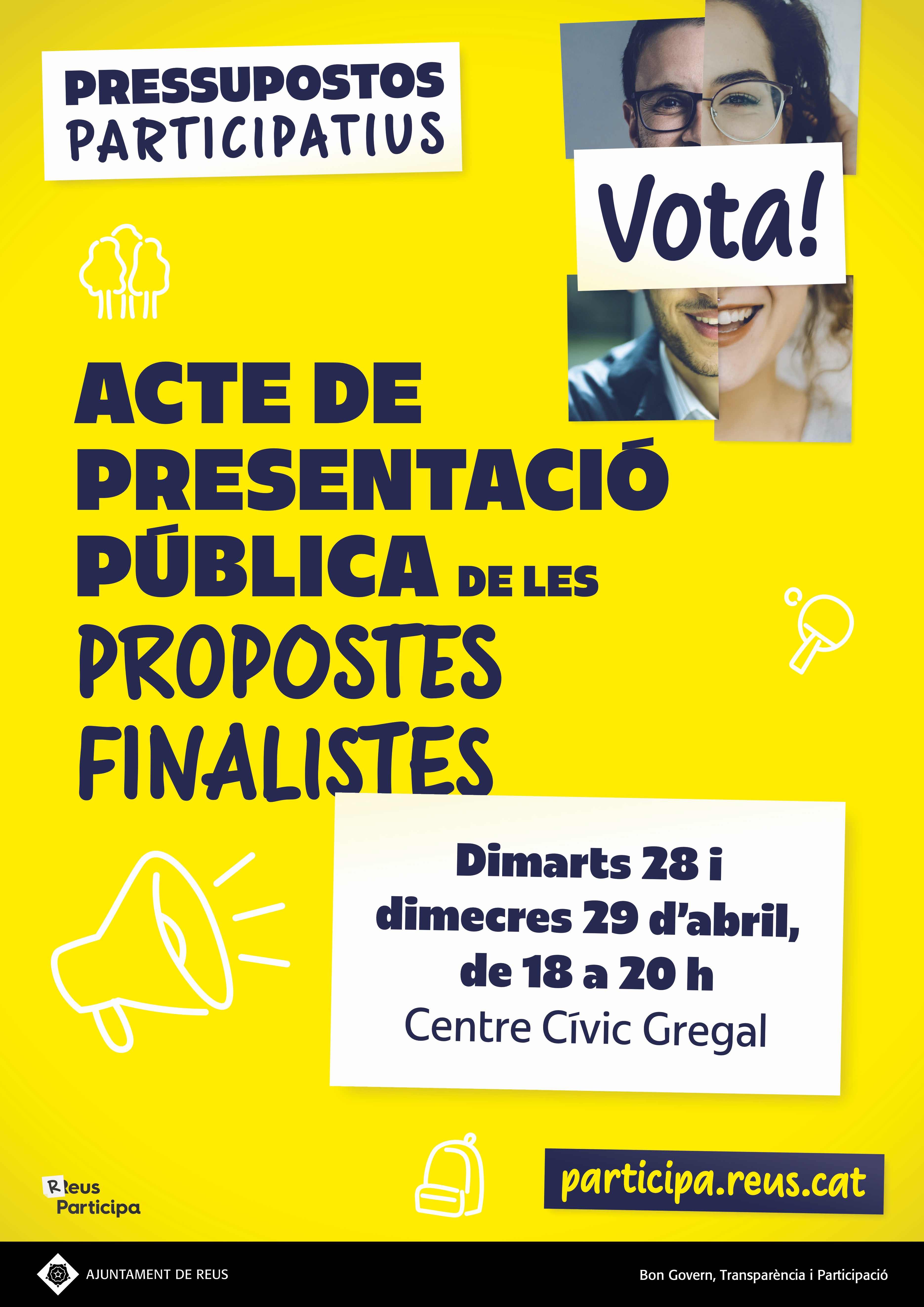 La ciutadania de Reus podrà conèixer de primera mà les propostes que han entrat a la fase de votació dels Pressupostos Participatius. Les persones proposants tenen l’opció de presentar públicament les seves propostes i buscar el suport de la ciutadania en sessions que tindran lloc al centre Cívic Gregal els dies 28 i 29 d'abril de 18:00 a 20:00h.