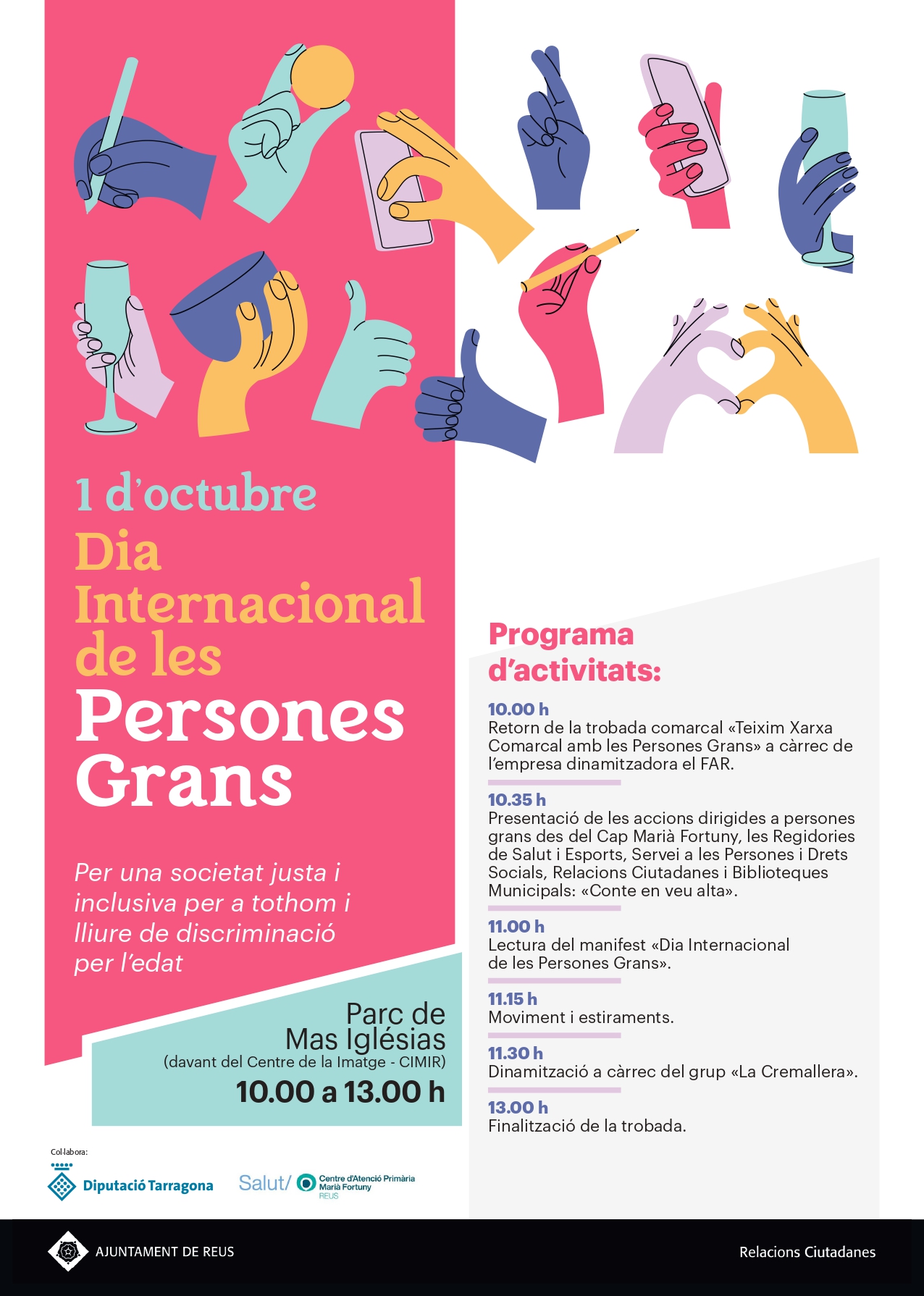 L’Ajuntament de Reus se suma un any més a la commemoració del Dia Internacional de les Persones Grans, que tindrà lloc demà dimecres 1 d’octubre al parc del Mas Iglesias, de 10 a 13 h, amb un programa d’activitats adreçat al col·lectiu longeu de la ciutat.