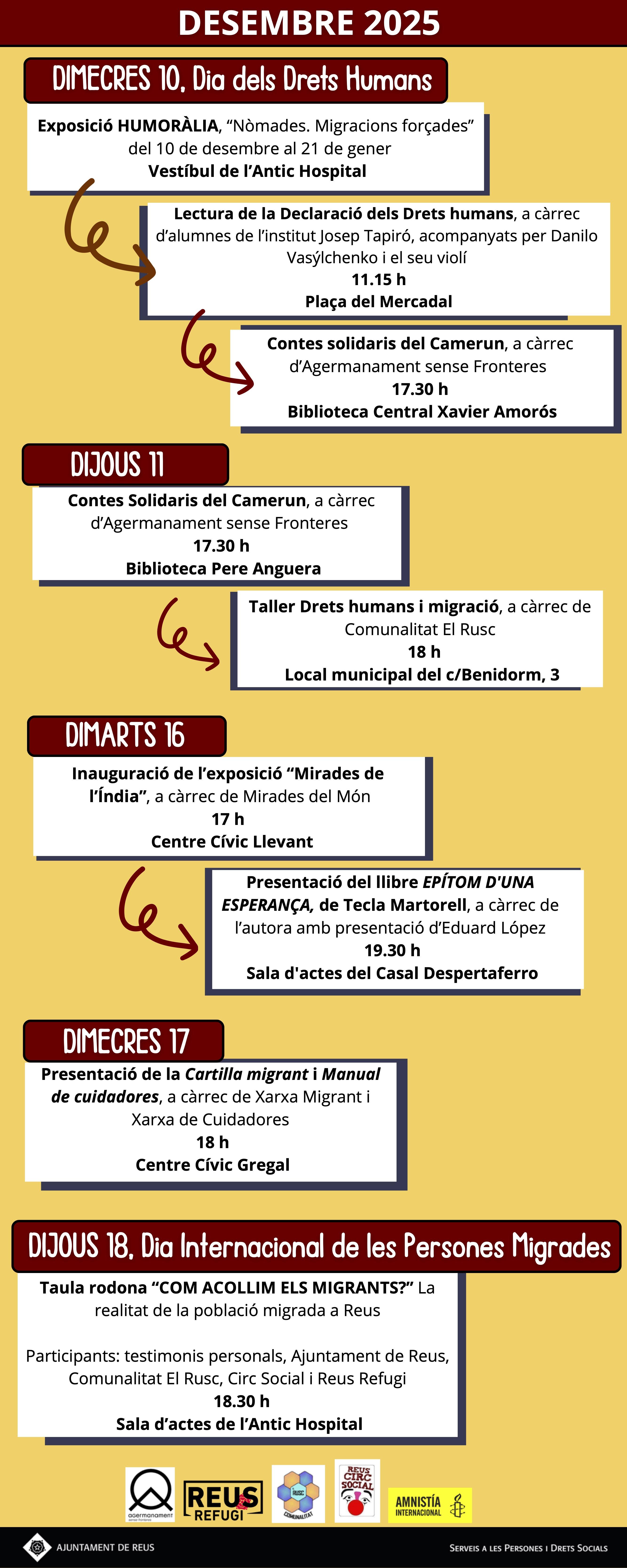 Per segon any consecutiu, l’Ajuntament de Reus organitza novament aquest desembre una programació conjunta per commemorar el Dia dels Drets Humans (10 de desembre) i el Dia Internacional de les Persones Migrants (18 de desembre). Les activitats inclouen exposicions, contes solidaris, tallers i presentacions, amb l’objectiu de promoure el coneixement i la defensa dels drets fonamentals, així com el reconeixement de la diversitat cultural present a la ciutat.