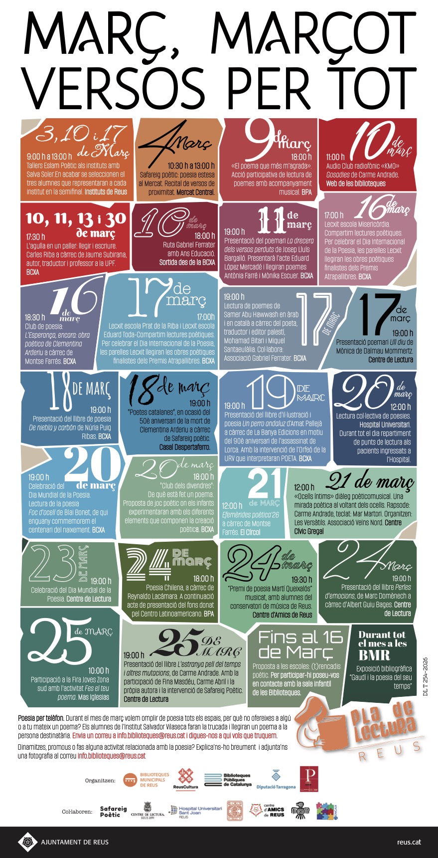 A més d’aquest esdeveniment, durant tot el mes de març, les Biblioteques Municipals de Reus ofereixen diverses propostes relacionades amb la poesia incloses dins del cicle “Març, marçot, versos per tot”. Una de les més destacades és la lectura de poemes de Saamer Abu Hawwash en àrab i català, a càrrec del poeta palestí Mohamed Bitari i Miquel Santaulàlia. L’acte es farà amb la col·laboració de l’Associació Gabriel Ferrater i tindrà lloc el 17 de març, a les 19 h, a la Biblioteca Xavier Amorós.