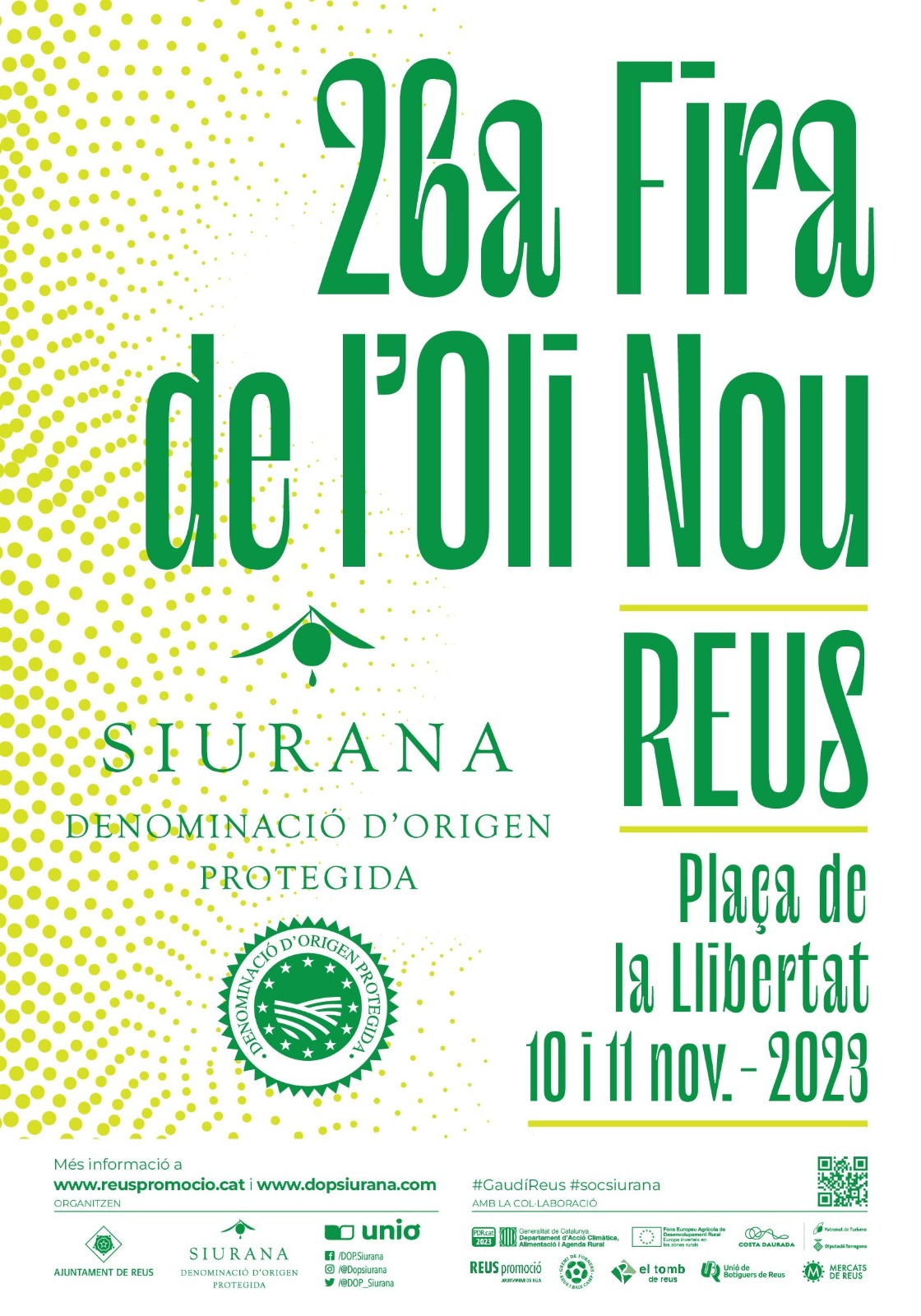 La plaça de la Llibertat començarà a preparar-se a partir de demà dimecres per rebre durant els dies 10 i 11 de novembre la 26ena edició de la Fira de l'Oli DOP Siurana (festa de l’oli nou), un certamen organitzat conjuntament per l’Agència de Promoció de Ciutat de l'Ajuntament de Reus, el Consell Regulador de la DOP Siurana i la Unió Corporació Alimentària de Reus, en la que són presents els productors més importants de la Denominació d’Origen, que presenten de forma col·lectiva el seu oli nou.