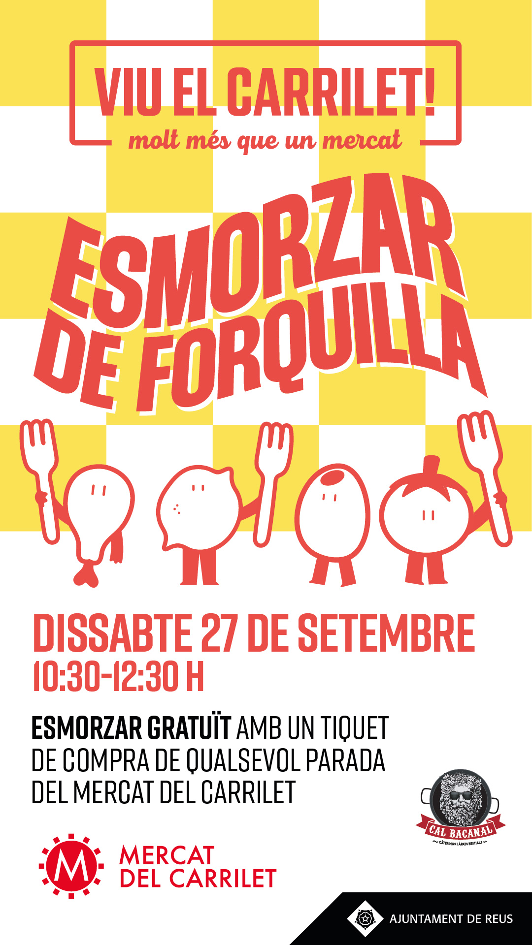 - Dissabte 27 de setembre. Esmorzar de foquilla, amb Cal Bacanal. De 10:30 a 12:30 h Tast gratuït amb un tiquet de compra de qualsevol parada del Mercat del Carrilet. 11 h Actuació del Ball de Valencians de Reus.